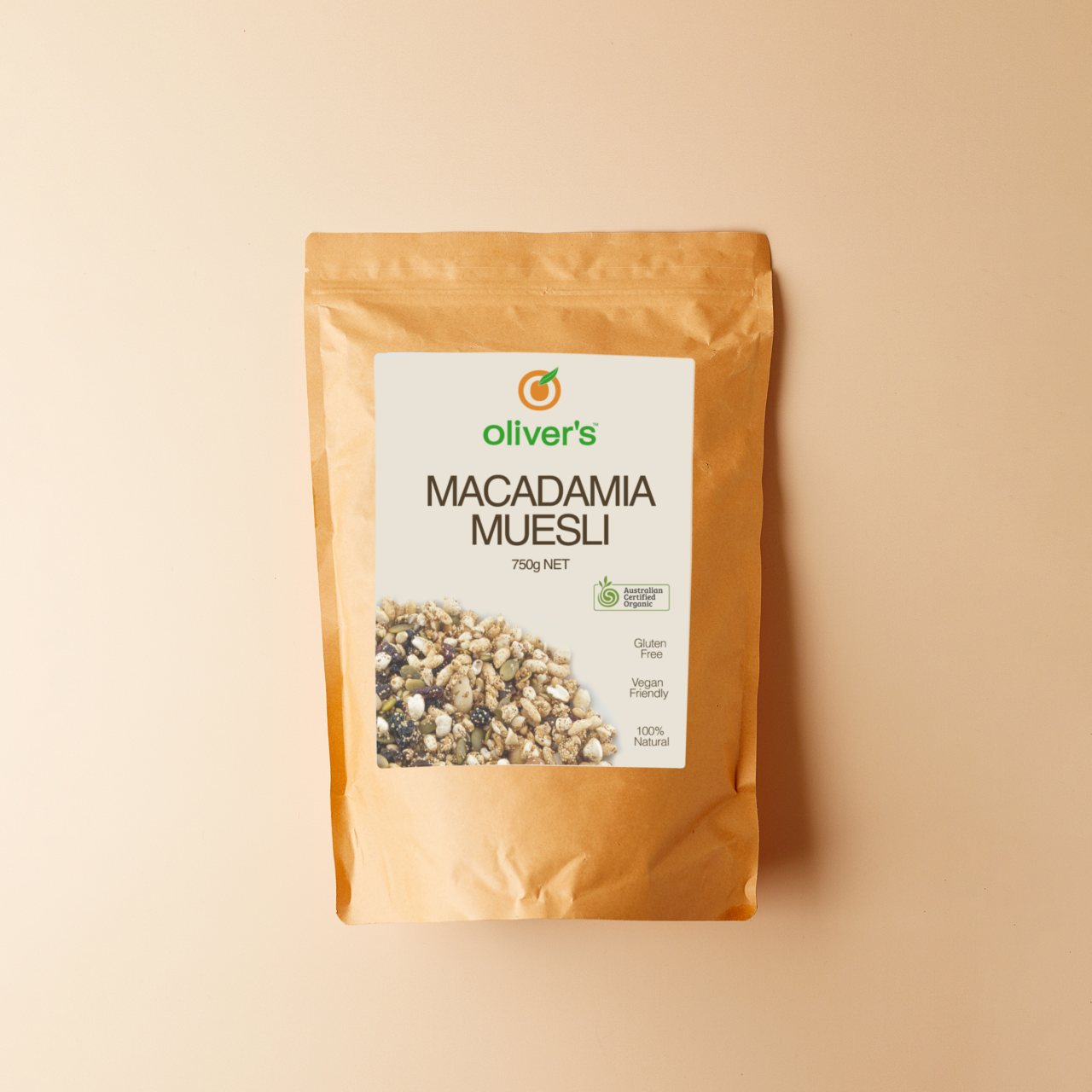 Oliver's certified organic Macadamia Muesli is the ultimate way to kickstart your day. Packed with the goodness of whole grains and seeds, fruits and macadamias, this gluten-free, wheat free and dairy-free muesli is high in fibre, a great source of protein, very low in sodium and cholesterol free, with no artificial colours, flavours or preservatives.